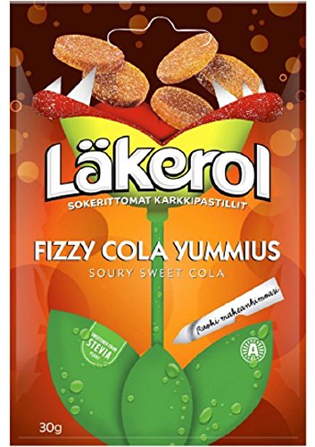 -. Feature : Lakerol Fizzy Cola Yummius / Soury sweet cola Sugar Free pastilles / Sweetener with stevia plant / Package includes 3 individual 1,05 oz packs / Made in Sweden