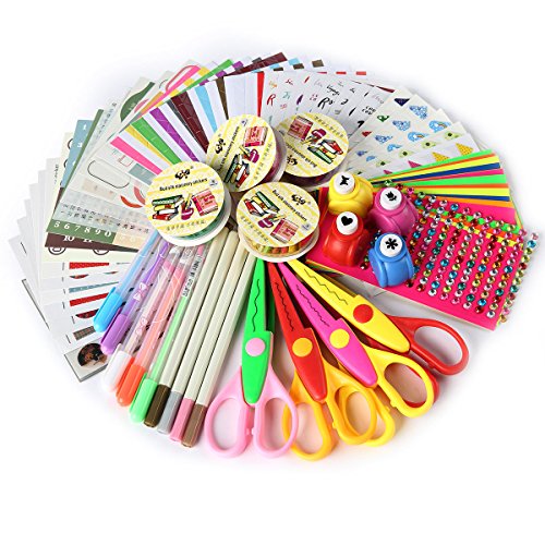- 4 edge wave scissors +4 Embossing kit+4 Lace tapes+20 sheet small color cards+9 color pens(Gold,Silver,Blue,Purple,White,Orange,Pink,Green,Brown)