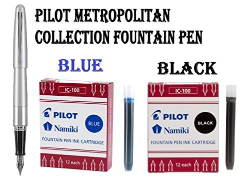 -. Binding : Office Product -. Brand : Pilot -. Color : Silver -. EAN : 0635665212026 -. Feature : Pilot's sleek Metropolitan Collection signature pens / Finest quality at a mid-range price / Ships with 1 Pilot black ink cartridge and 1 Pilot Press Plate Converter plus 12 black and 12 blue ink cartridge / Silver barrel -. Label : Pilot -. Manufacturer : Pilot -. Model : 9.11E+14 -. MPN : 911086910169100 -. PartNumber : 911086910169100 -. ProductGroup : Office Product -. ProductTypeName : WRITING_INSTRUMENT -. Publisher : Pilot -. Studio : Pilot -. Title : Pilot Metropolitan Collection Fountain Pen, Silver Barrel, Classic Design, Medium Nib, Black Ink (91108) with Namiki Blue and Black Ink -. UPC : 635665212026