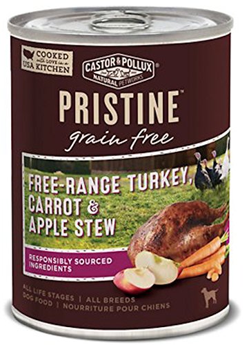 Feed your precious pup purposeful, complete nutrition with Castor & Pollux PRISTINE Grain-Free Turkey, Chicken or Lamb Stew Canned Dog Food. The only complete line of pet food made with responsibly sourced ingredients, this wholesome and delicious recipe starts with organic-fed turkey, chicken or lamb that is responsibly raised with access to fresh air, natural light and space to roam. Real organic produce is grown without synthetic fertilizers or chemical pesticides, on farms that care for the earth. All that healthy, whole food nutrition is prepared for your pooch right here in the USA because better ingredients make better food for your best friend's health.Feature