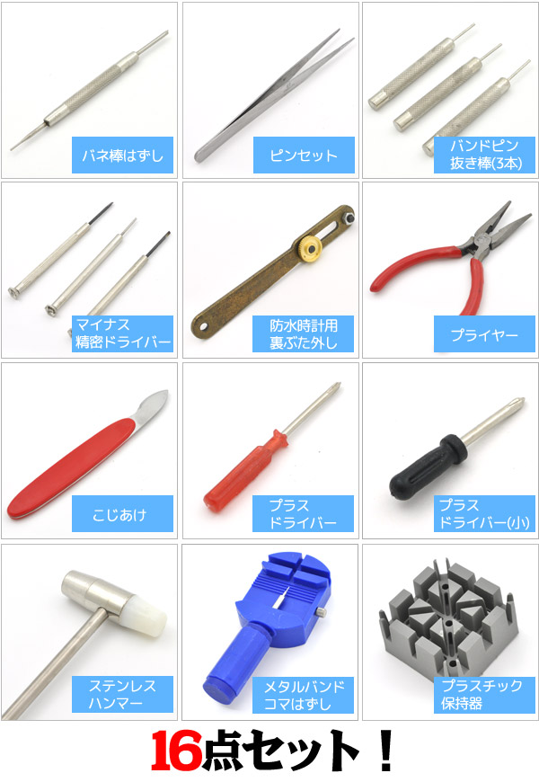 セット内容バネ棒はずし・ピンセット・バンドピン抜き棒(3本)・マイナス精密ドライバー ・防水時計用裏ぶたはずし・プライヤー・こじあけ・プラスドライバー・プラスドライバー(小) ・ステンレスハンマー・メタルバンドコマはずし・プラスチック保持器