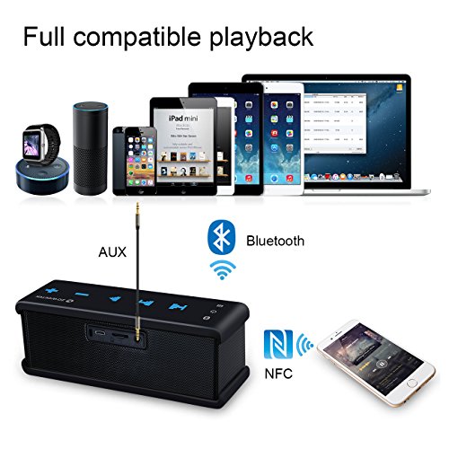 - Adopts bluetooth 4.1 BR/EDR wireless technology, stable connection distance up to 10M (33 ft),no delay, no automatic disconnection (Can press Play/Pause button for 3~5 seconds to reset bluetooth). Supports NFC fast cordless connection, finishing NFC connection only with a slight touch, very easy. Supports 3.5 mm AUX audio input wired playing and TF(Mirco SD) card playing. Multi connection ways meet all kinds of indoor and outdoor conditions.