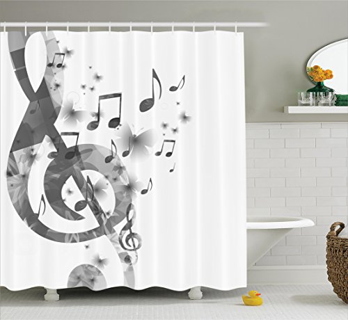 Ambesonne Music Decor Collection, Music with G-Clef Key Instrument Monochrome Creative Rhythmic Ornate Image Pattern, Polyester Fabric Bathroom Shower Curtain Set with Hooks, Gray White