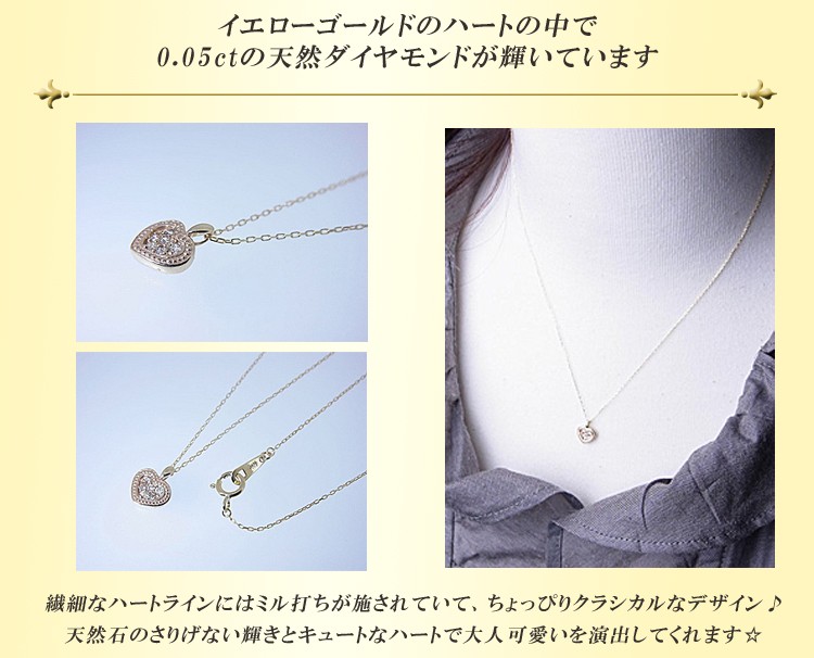 商品説明 繊細なハートラインにミル打ち加工されたちょっぴりクラシカルなデザインのイエローゴールドのダイヤモンドネックレスです。トップはピングゴールドになります。