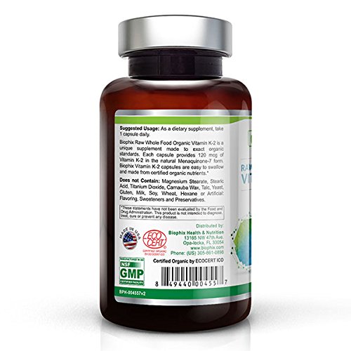 -. Binding : Health and Beauty -. Brand : biophix -. EAN : 0849440004557 -. Feature : Organic / Wholefood Dietary supplement / Vegan -. Label : Biophix -. LegalDisclaimer : This information is intended for your general knowledge only and is not substitute for professional medical advice or treatment for specific medical conditions. This information is not intended to diagnose, treat, cure or prevent any disease. Always seek the advice of your qualified physician or other health care provider with any questions you may have regarding a medical condition. Keep out of reach of children. -. Manufacturer : Biophix -. MPN : 0849440004557 -. NumberOfItems : 1 -. PackageQuantity : 1 -. PartNumber : 0849440004557 -. ProductGroup : Health and Beauty -. ProductTypeName : HEALTH_PERSONAL_CARE -. Publisher : Biophix -. Studio : Biophix -. Title : Biophix Vitamin K-2 MK-7 USDA Organic 120mcg 60 Vcaps -. UPC : 849440004557