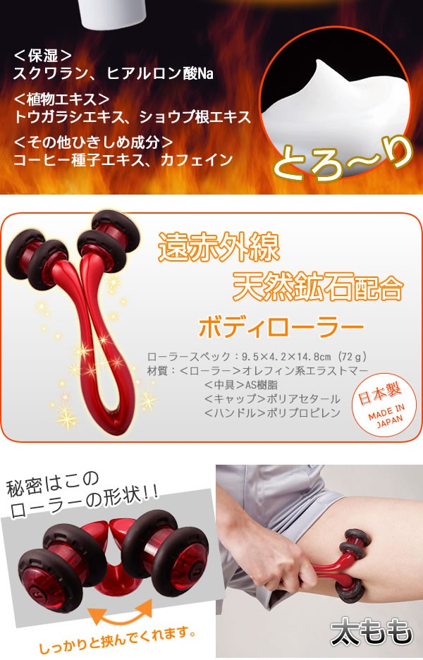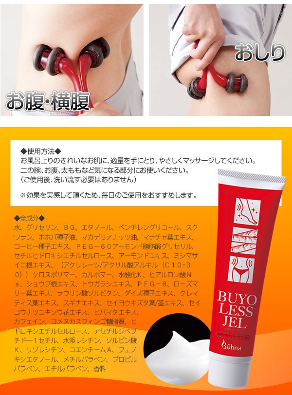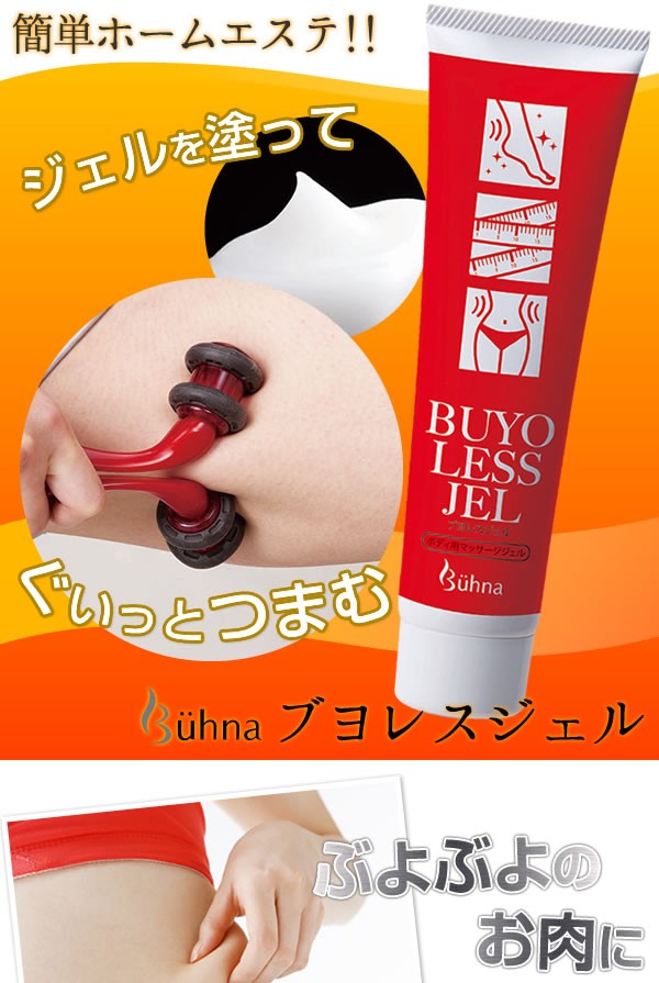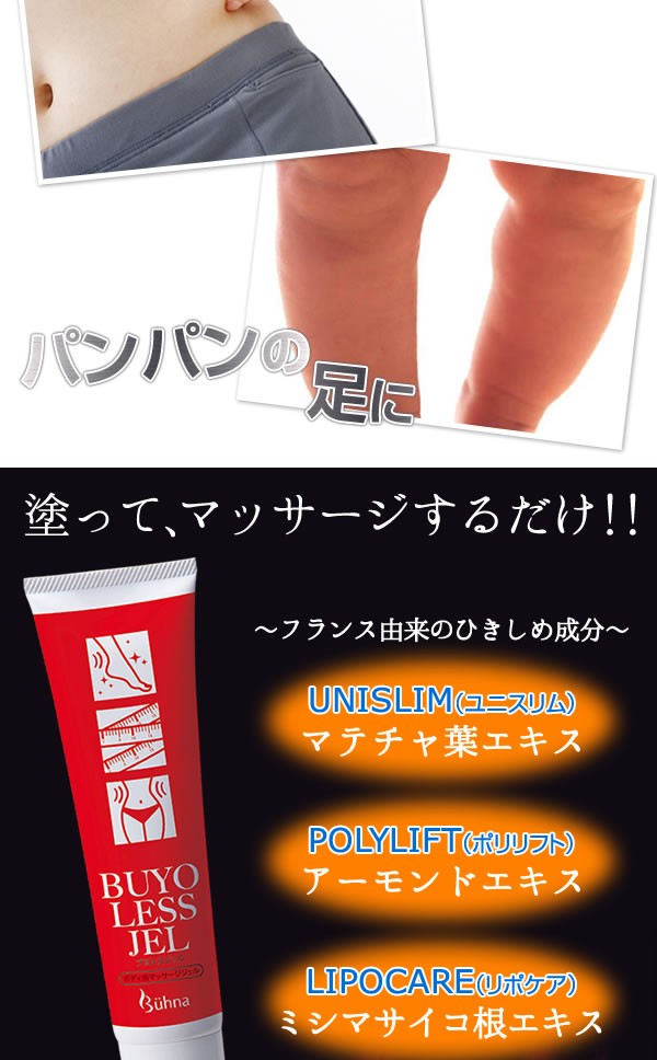 | ブヨブヨの体に!!パンパンの足に!!フランス由来のお肌ひきしめ成分(ユニスリム・ポリリフト・リポケア)配合のジェルクリーム。ブヨレスジェルを塗ってボディローラーでコロコロすれば、簡単自宅エステ!! |