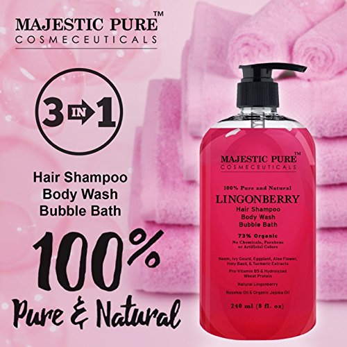 - Majestic Pure Lingonberry Gentle Shampoo, Body Wash & Bubble Bath; contains 73% of organic content; with powerful ingredient such as neem, ivy gourd, eggplant, aloe flower, holy basil, turmeric extracts, pro-vitamin B5, hydrolyzed wheat protein, lingonberry, rosehip oil, and organic jojoba oil; paraben free; sulfate free natural shampoo