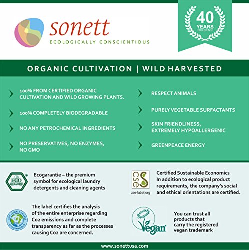 -. Feature : Sonett has been a pioneer in natural laundry detergents and cleaners since 1977. Sonett's mission is to make laundry soaps and cleaning products that are harmonious and revitalizing to water and the environment. Germany's most trusted household cleaning brand. / It protects waxed, oiled and varnished floors with a natural wax film and without building up layers. It is suitable for tiles, stone, wood, cork, parquet flooring, laminate, linoleum and synthetic flooring. / Certified organically grown - 100% BIODEGRADABLE - Recyclable container / Free from petrochemical solvents, brighteners, lsifiers and preservatives. Free from silicone oils. Completely biodegradable. / Non-GMO. Never tested on animals. No enzymes, petrochemical raw materials or nanotechnology. Certified by Eco-guarantie, EcoControl.