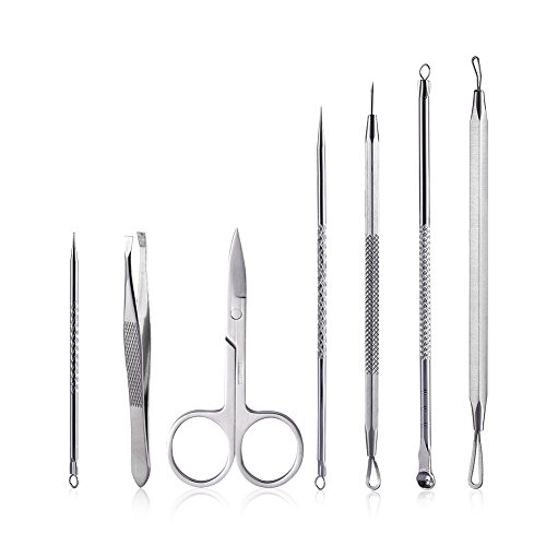 -. Feature : 6-in-1 Blackhead Remover---Made of surgical grade anti-microbial stainless steel,abrasion and corrosion resistant ,uniform surface polishing. / Non-slip Handle---Skidproof texture for comfortable grip and better control, reduce the risk of scratching your skin. / Mutifunctional tools---perfect for popping pimples, pinching zits, squeezing whitehead, removing acne and blackheads. / Elegant Zipper Case---Lightweight and portable,easy to store every tools and fit in your bag conveniently. / Instructions---wipe tools with alcohol cloth, then puncture acne with steel needle and press ring set in the acne area, clean up the dirty quickly.