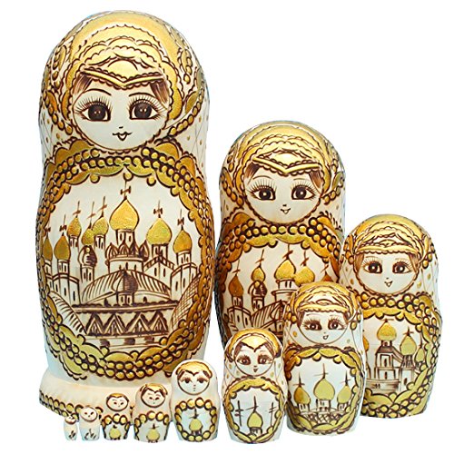 -. Feature : Traditional Russian nesting dolls with Moscow Kremlin pattern,filled with russian charm / Contains 10 dolls with decreasing size placed one inside the other to appear as one / The color is simple,just natural color and gold,but that makes it more classical and elegant / Kids will love these beautiful matryoshka dolls and spend time playing with them / It's special and unique,you can use it to decorate your house,feel the exoticism of russia