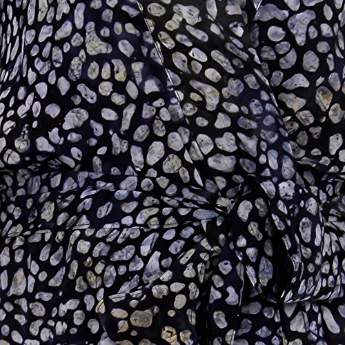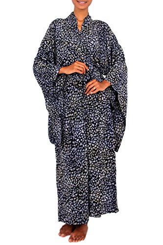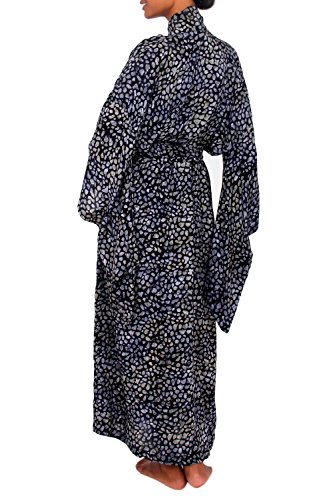 About this item: Saktuk and Victoria in Bali present this delightful rayon robe, hand-stamped with an irregular pebble batik motif. Featuring dramatic kimono-design sleeves, the robe is slate gray with nuances of blue and green on a black background. The soft rayon fabric drapes beautifully. Robe: 54.0" Length (from high-point shoulder) x 57.0" Bust/chest x 25.5" Sleeve (center neck to cuff) Belt: 77.0" L x 3.1" W - Dry in the shade