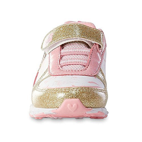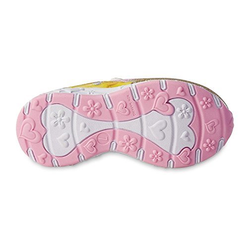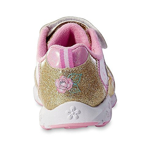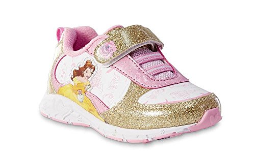 Her step will have magical glimmer when she wears this toddler girls' Beauty and the Beast athletic shoe by Disney. Glitter panels accent this synthetic leather design. An applique of Belle holding Mrs. Potts and Chip adds to the fun design. A hook-and-loop strap and nonmarking sole complete this fun gym shoe.