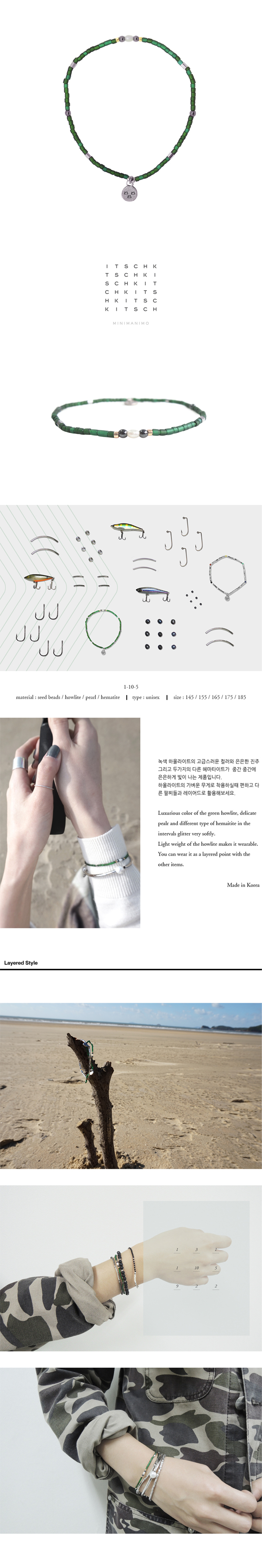 녹색 하올라이트의 고급스러운 컬러와 은은한 진주 그리고 두가지의 다른 헤마타이트가
