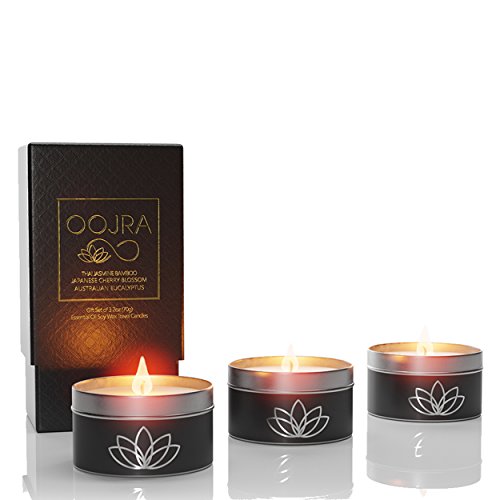 Oojra Essential Oil Scented Soy Wax Luxury Travel Candle Gift Set of 3 with Gift Box - Thai Jasmine Bamboo, Australian Eucalyptus, Japanese Cherry Blossom