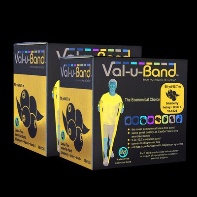 Studio : Val-U-Band Publisher : Val-U-Band Binding : Health and Beauty Product Description The Twin-Pak has 100 yards of exercise band (2 x 50 yard rolls) and is the most cost effective way to outfit your facility. Latex Free resistive exercise Val-u-Band is color-coded in berry colors. Latex Free Val-u-Band is an economical latex free exercise band. Same great quality as CanDo latex exercise bands. 5 inch width band available in dispenser boxes. Levels range in order of resistance from least to greatest resistance: pear (0), peach (1), orange (2), lime (3), blueberry (4), plum (5), mushroom (6), pineapple (7). 0