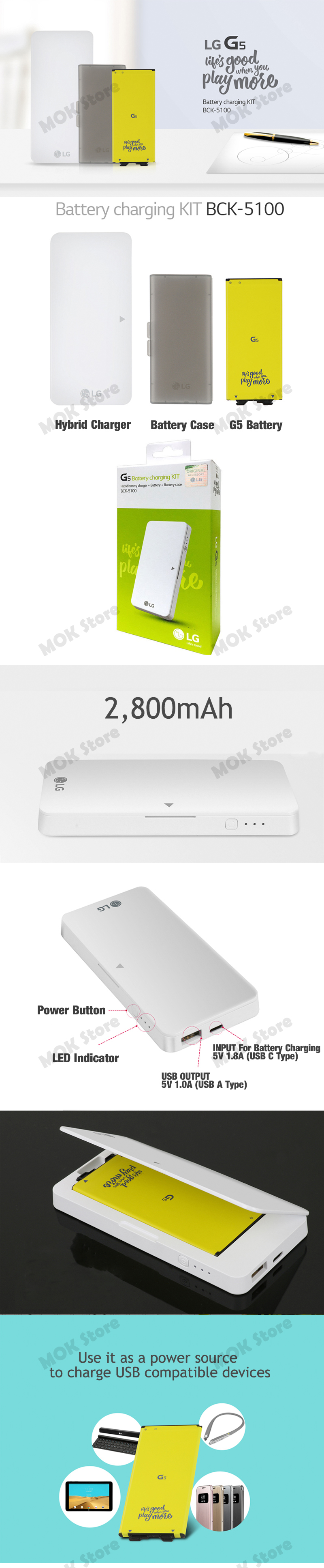 - Hybrid battery charger : INPUT 5V 1.8A (USB C Type) / OUTPUT 5V 1.0A (USB A Type)