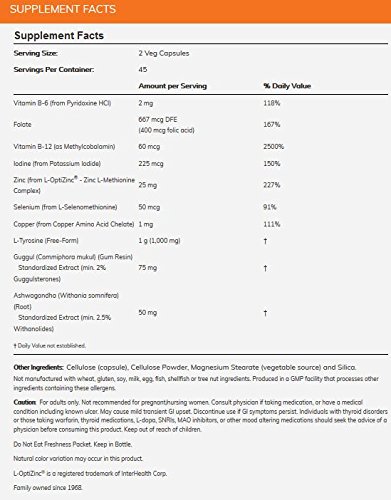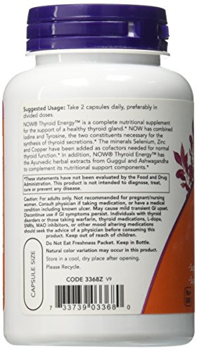 NOW® Thyroid Energy™ is a complete nutritional supplement for the support of healthy thyroid function. NOW® has combined Iodine (from Kelp) and Tyrosine, the two integral constituents of thyroid hormone, with the minerals Selenium, Zinc and Copper, to assist in its production. In addition, NOW® Thyroid Energy™ contains Guggul Extract, an Ayurvedic herb known for its ability to support a healthy metabolism.*Feature