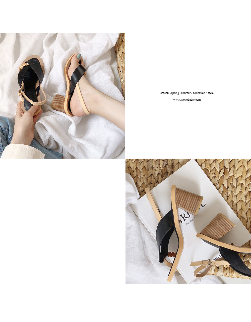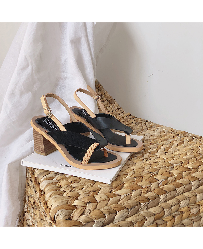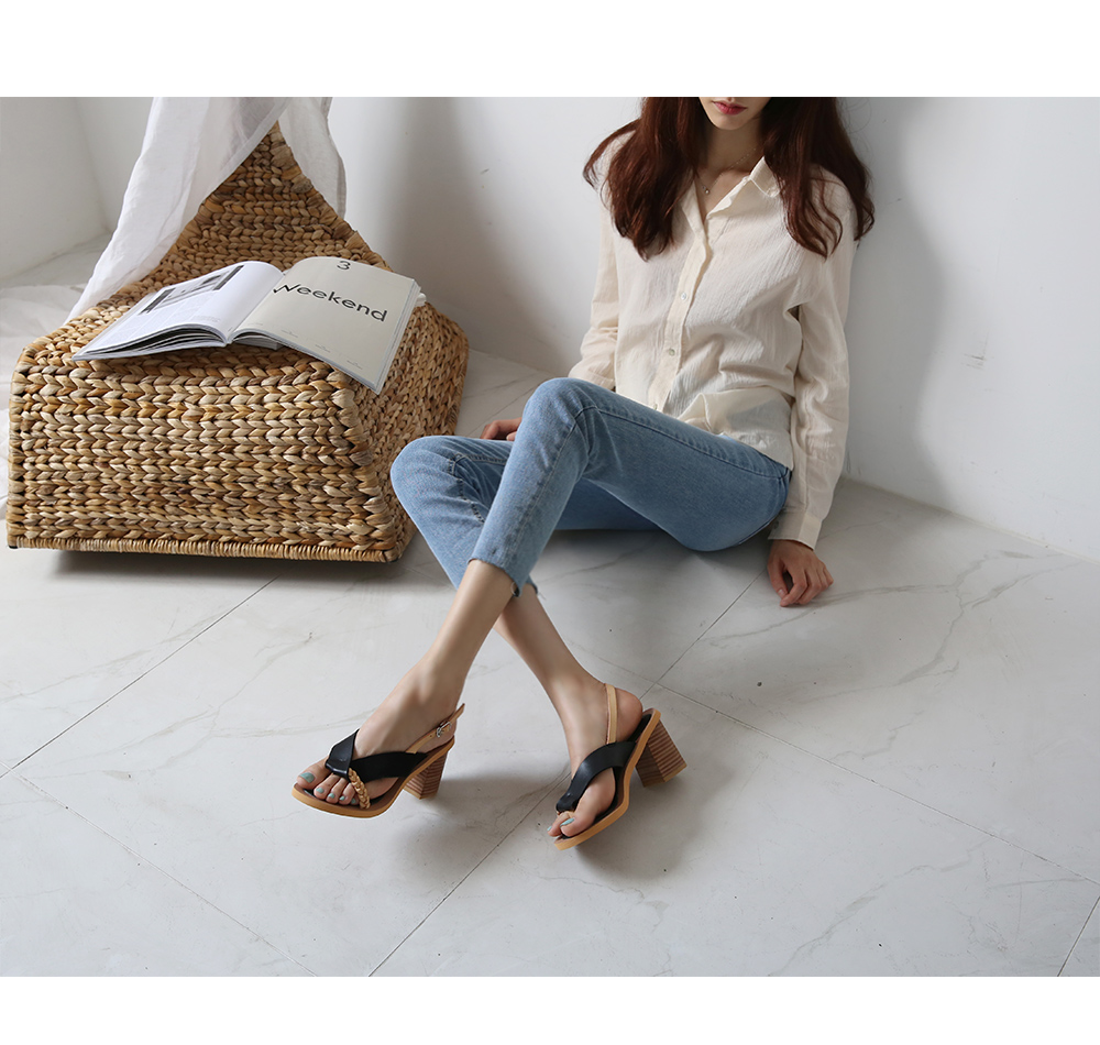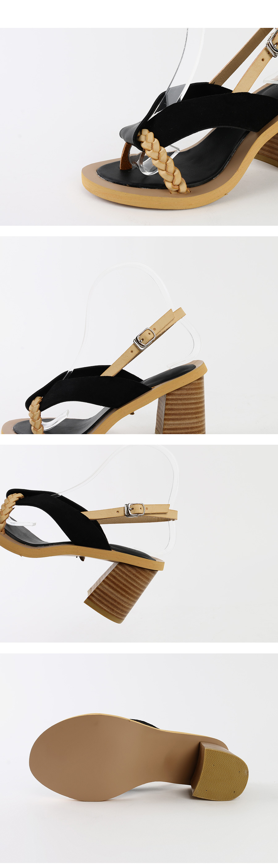 우드느낌의 청키한 하이굽이지만 토 부분의 꼬아진 가죽 스트랩이 엄지 발가락을 제외하고 나머지 발가락들을 잡아주어 편안한 워킹을 보여줍니다.