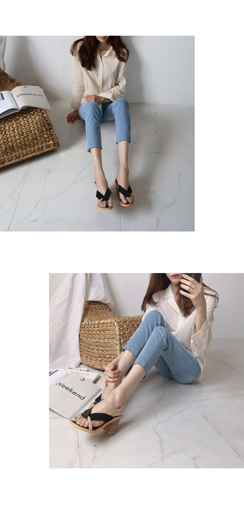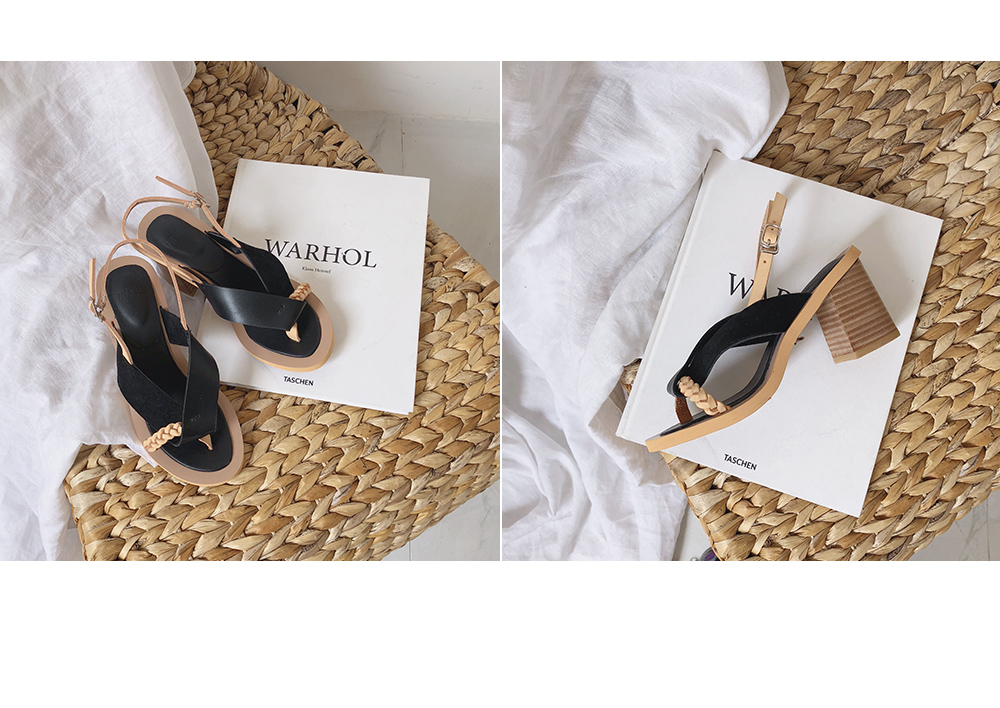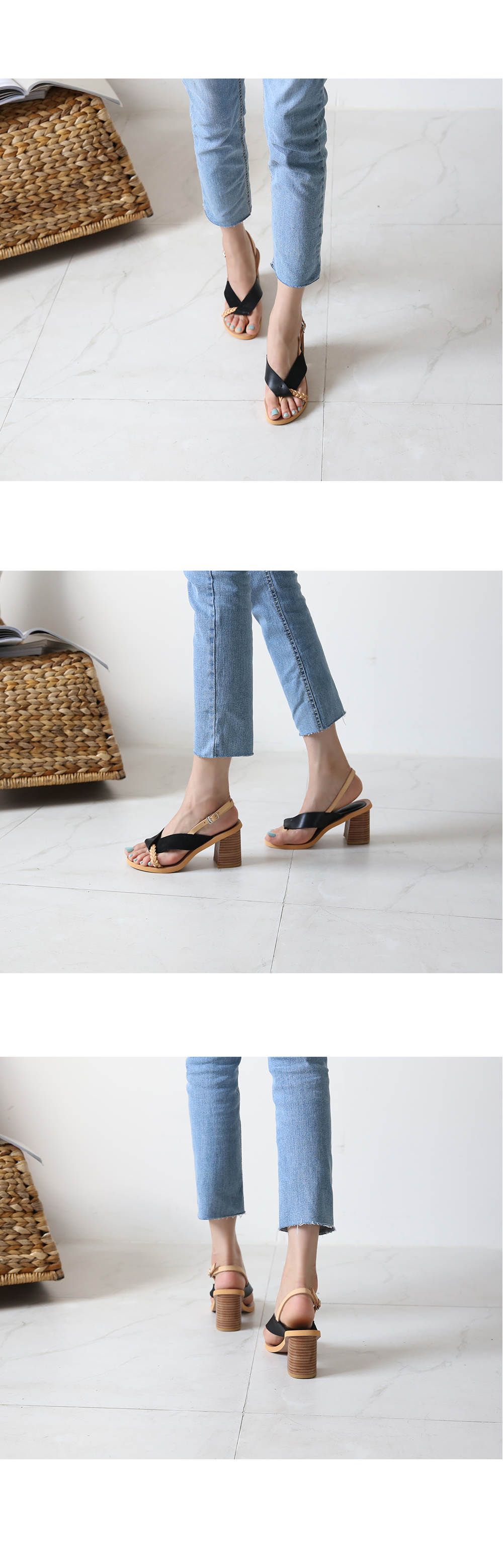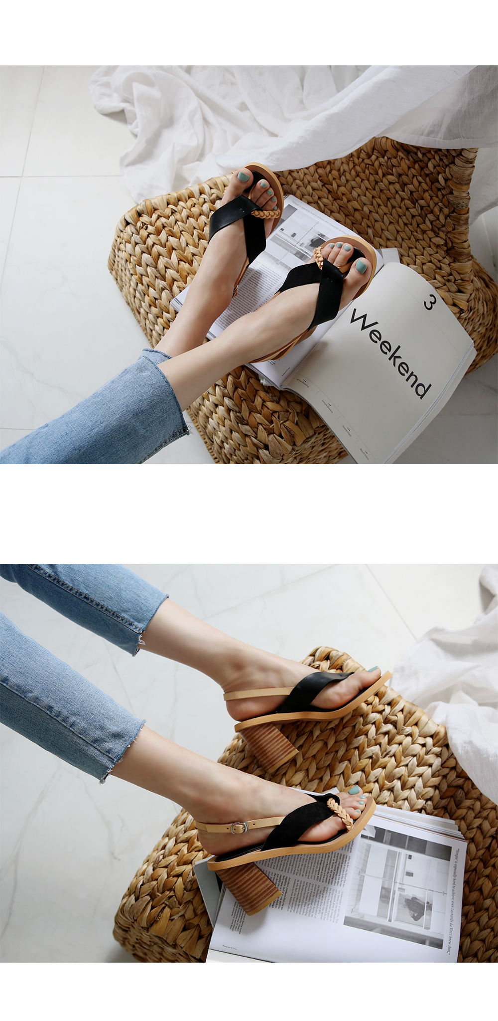 우드느낌의 청키한 하이굽이지만 토 부분의 꼬아진 가죽 스트랩이 엄지 발가락을 제외하고 나머지 발가락들을 잡아주어 편안한 워킹을 보여줍니다.