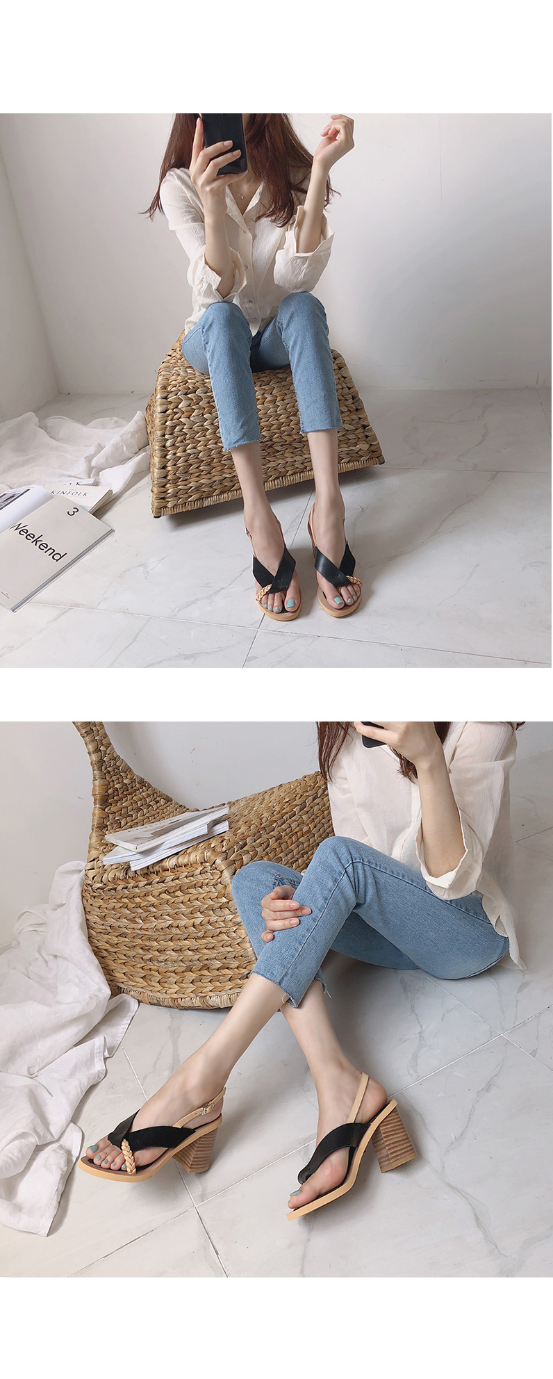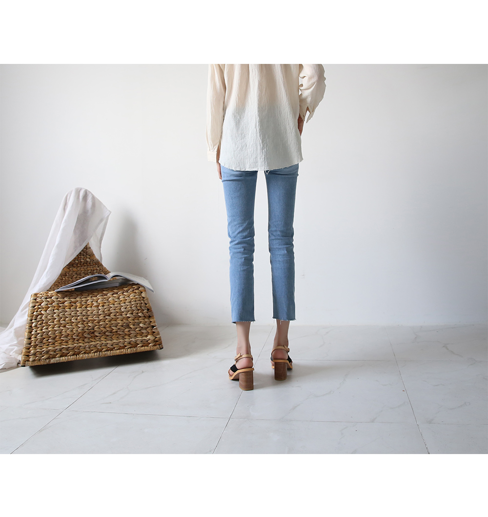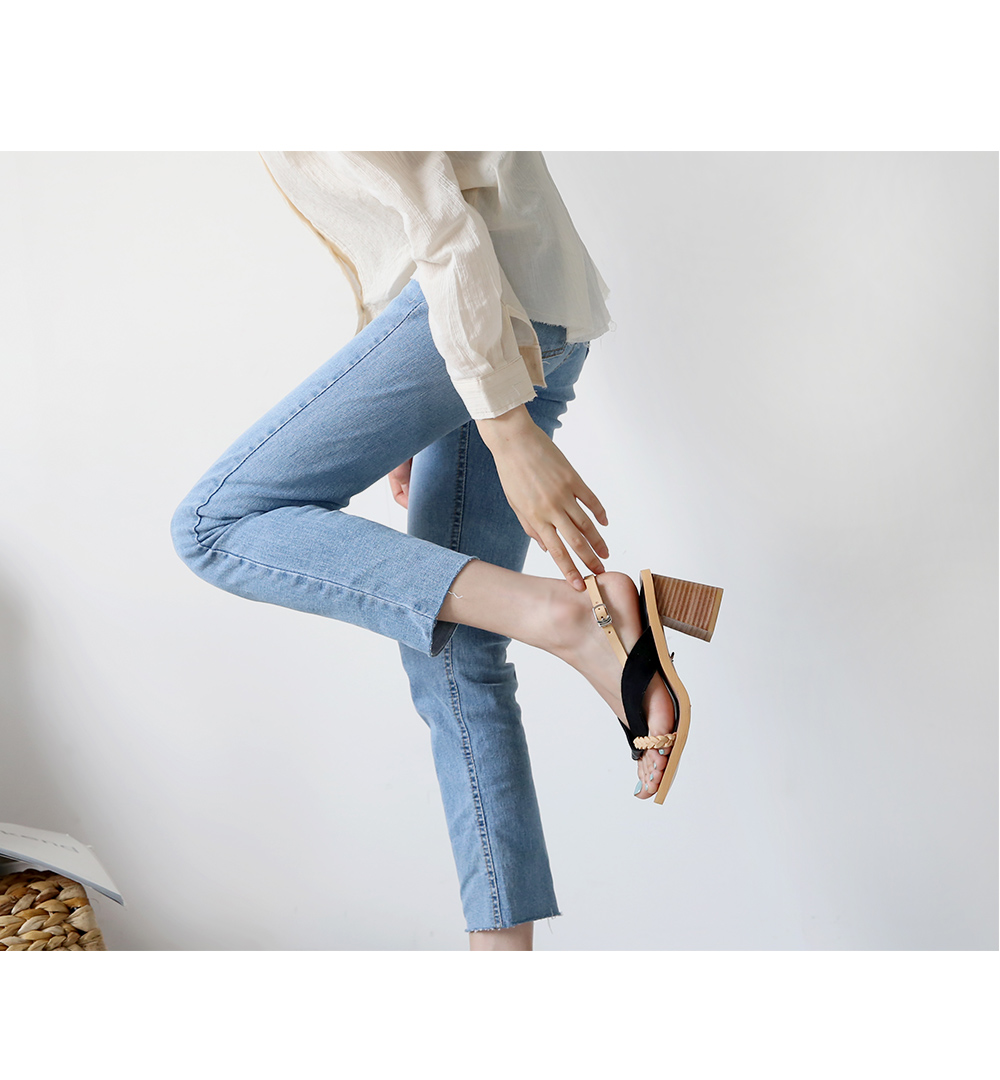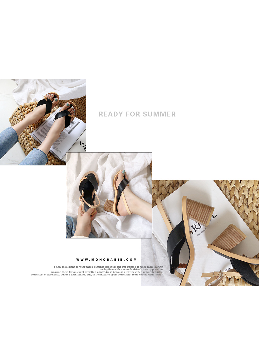 우드느낌의 청키한 하이굽이지만 토 부분의 꼬아진 가죽 스트랩이 엄지 발가락을 제외하고 나머지 발가락들을 잡아주어 편안한 워킹을 보여줍니다.