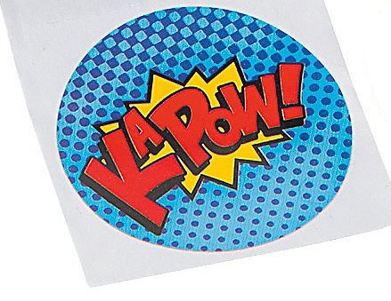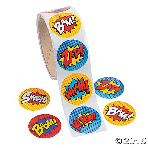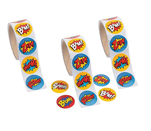 Studio : Party Supplies Publisher : Party Supplies Binding : Toy Product Description Wham! Kapow! Smash! Boom! Bam and Zap your way to superhero status with these stickers. Throwing a superhero birthday party? Decorations can include these fun stickers with popular superhero sayings and graphics. Also perfect for school, superhero chore charts, and more! (3 x 100 pcs. per roll, shrink-wrapped) Size: 1 1/2" 0
