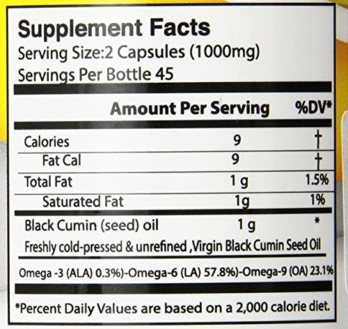 -. Feature : HEALTHY: Black seed (cumin)90 Softgel. Oil Freshly Cold-Pressed in NY Virgin Unfiltered not imported oil / FRESH: Provide a convenient way to take a consistent amount of Black Seed oil without the distinctive taste of the oil / WHOLESOME: Dietary supplement produced locally in the USA by a family owned business. / NUTRITION: Combined, these compounds provide powerful and wide-ranging benefits. / BONUS: Black seed is often referred to as Roman coriander, black caraway, black sesame, onion seed, kalonji oil, and black cumin know for its wide variety of benefits.