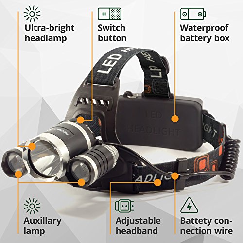 • WATERPROOF AND HEATPROOF: A super bright waterproof LED head light ideal for survival in extreme conditions. The housing features a dust, corrosion and impact-resistant to 6.6' for climbing, hiking and camping, which is submersible to 6.6' for about 30 minutes.