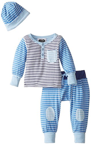 3 piece set. Soft bamboo viscose blend take me home set has multi colored striped top and bottoms with contrasting knee patches. Comes with coordinating cap. Arrives on padded hanger.Feature