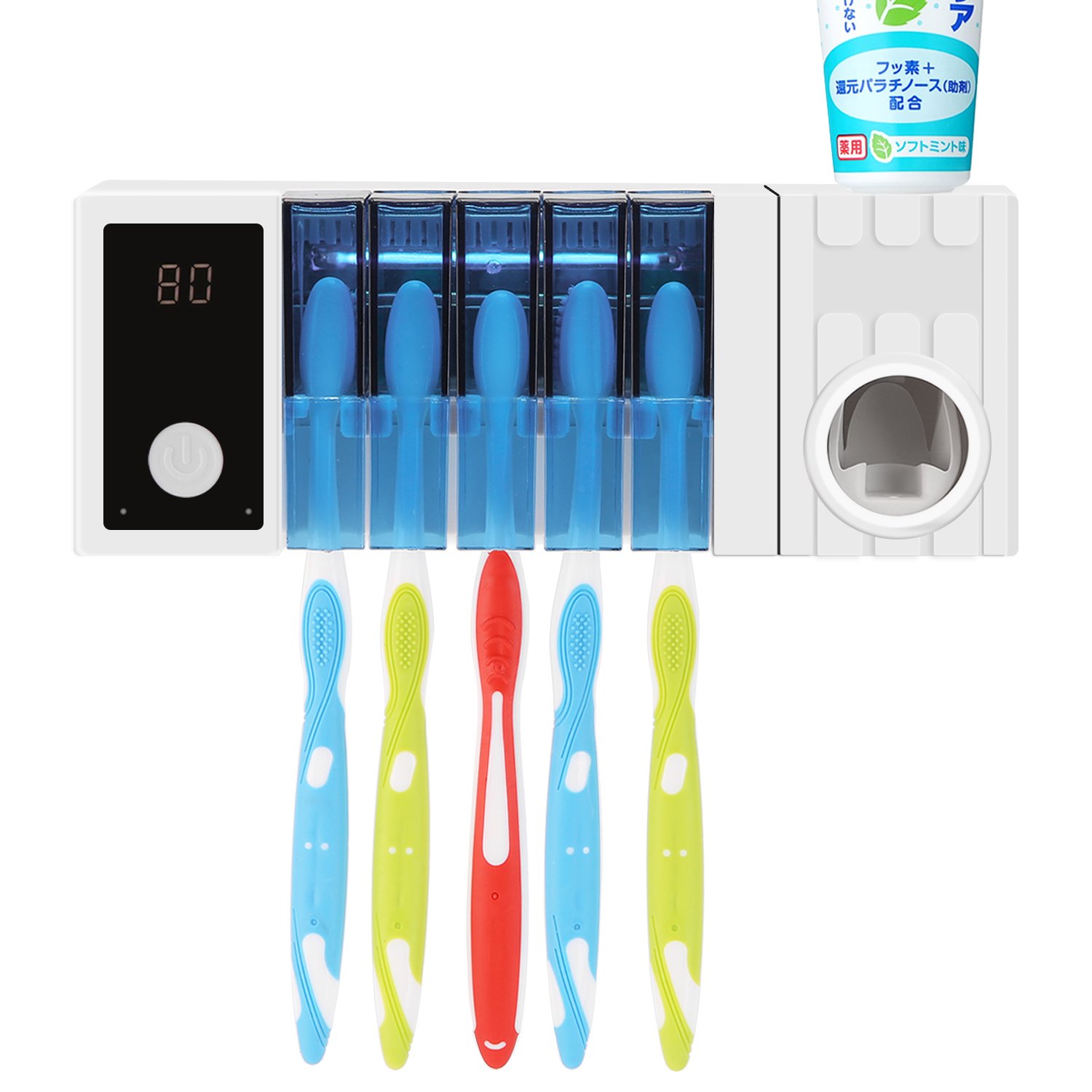 【自動タイマー、自動歯磨きディスペンサー】8分でUV紫外線除菌、加熱乾燥が終わると自動でOFFになるので手間いらず。自動歯磨き粉ディスペンサー付き、歯ブラシの接触による相互間細菌移転を防ぐ。衛生的で安心感がある。