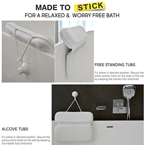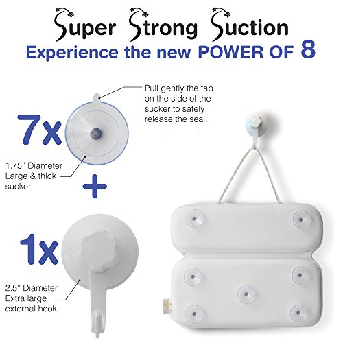 - ★PERFECTION INSIDE & OUT – From foam to fabric, every aspect of the pillow was tested and redesigned to offer you a unique experience. With 8 superior suction points, 7 built-in large suction cups and an external super strong hook it will not budge. Fits any tub size or shape( Alcove tubs, free standing/ clove feet tubs, Jacuzzi and whirlpool)