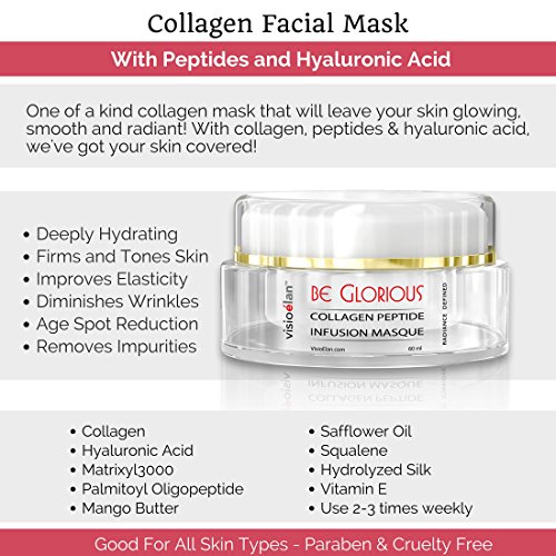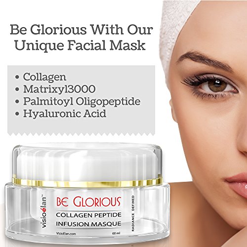 COLLAGEN PEPTIDE FACIAL MASK AT HOME! Visio Elan's Be Glorious Collagen Peptide Facial Mask with two powerful peptides, marine collagen and hyaluronic acid will leave your skin feeling firm and as smooth as silk as if you just left an expensive spa!