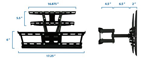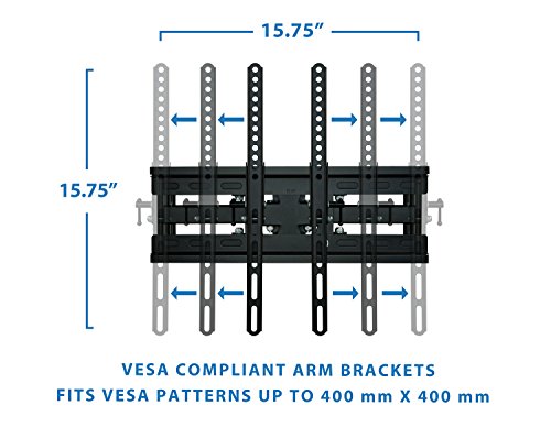 -. Feature : Universal TV wall mounting bracket design fits most of 20-50" LCD/LED/Plasma TVs on the market (even up to some 55 inch TVs) up to VESA 400x400 and 115lbs (Fits 400X400, 400X300, 400X200, 300X300, 300X200, 200X200, 200X100, 200X150, 100X100, 75X75mm). Please check the VESA (mounting hole pattern behind TV), stud spacing, possible blocked cable/input and your TV weight P.R.Ior to making purchase decision to determine whether this TV wall mount fits your TV and the installation application. / This wall mounting kit is compatible with Samsung, Sony, LG, Sharp, Insignia, Vizio, Haier, Toshiba, Sharp, Element, TCL, Westinghouse 20,22, 24, 26, 30, 32, 40, 42, 48, 49, 50, 51, 52, 55 inch TVs. / Tilt, Swivel, Articulate, Extend, Collapse with this universal TV wall mounting bracket. Full motion capability makes is ideal for corner installation, over a fireplace, inside a TV center. This slim mount is designed to be installed on 16 inch spaced wall studs. TV stays as close as 2.7" from the wall or can extend up to 13.5 inches. Swivels left or right 90 degrees. / Continuous Tilt Feature (up to 12 degrees down or 2 degrees up) for Better Viewing Angle and Reduced Glare. Low-profile design ensures TV is close to the wall for a sleek finish. Cable management feature will neatly organize cables for a professional installation. / Weight rated to 115 lbs - This bracket is one of the strongest brackets available on Amazon. Install your precious TV with confidence. Constructed from Reinforced Steel. Quick and easy to install - bracket comes complete with full instructions, and FREE INSTALLATION HARDWARE WITH A FREE CABLE