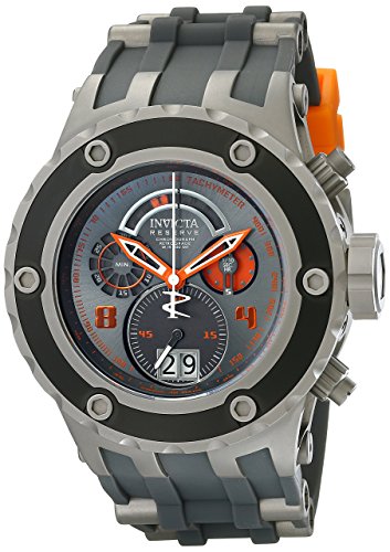 -. Feature : Chronograph functions with 60 second, 30 minute and 1/10 of a second, retrograde day of the week sub dials; date window at 6:00; invite reserve 5-year warranty included with shipment / Grey dial with orange and white hands and orange hour markers; luminous; black ion-plated stainless steel bezel; screw-down crown and pushers; tachymeter; flame fusion crystal; titanium ion-plated stainless steel case; grey silicone strap with titanium ion-plated stainless steel accents and orange loops / Swiss-quartz movement / Case diameter: 52mm / Water resistant to 1640 feet