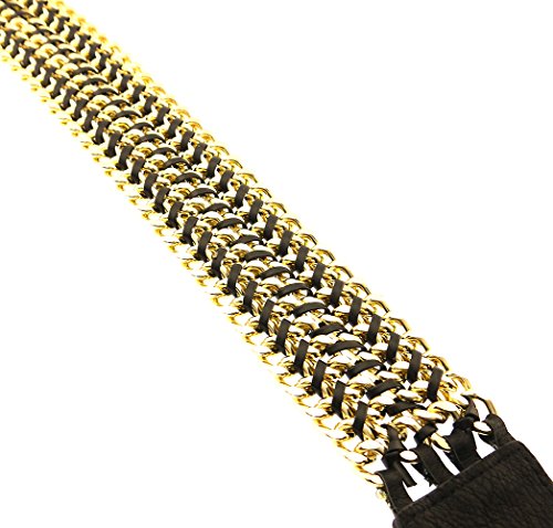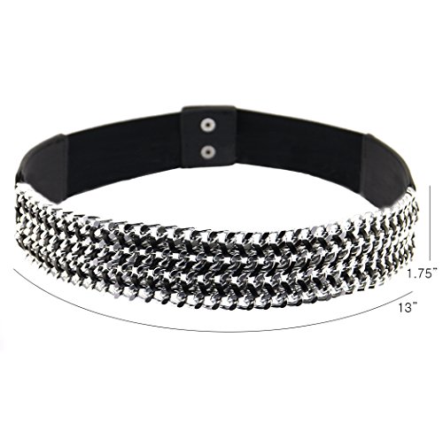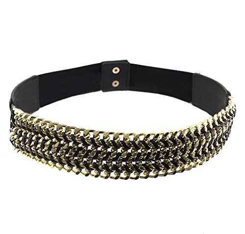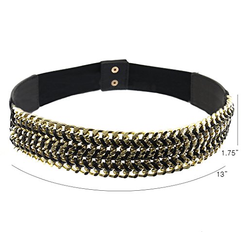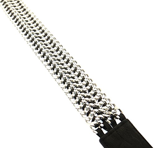 -. Binding : Apparel -. Brand : BlingKicks -. Department : womens -. Feature : Stretches to fit most waists. From 28 inches to 34 inches waist size. Elastics and PU unstretched measure approximately 28 inches. Will fit dress size up to 10. / 4 layers of chunky cuban chain of about 12 mm are intricately interwoven with strings of leather cords. / The chains make up a center piece of measurements 13 inches long and 1.75 inches wide. / Match any dress to add some center of focus with trendy chain texture. -. ProductGroup : Apparel -. ProductTypeName : ACCESSORY -. Title : BlingKicks Womens Interwoven Multi Layer Chain Stretch Belt