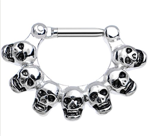 Goth septum clicker features a lineup of macabre skulls. 16 gauge (1.2mm) stainless steel bar, skulls are brass plated with rhodium FINISH Flip up, insert, snap down. For adult use in healed piercings