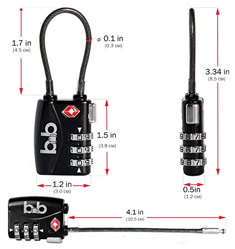 Product Description Do you often travel abroad and looking for reliable travel accessory that will help to keep your luggage secure during air travel? Perhaps you are searching a small combination lock equipped with sturdy but flexible cable that will easily slip even through zippers of the bag or backpack? Maybe are you just searching for a portable combination lock for a new locker at the gym? Your search has finally ended - here are BB BagsBackpacks padlocks with combination - TSA luggage locks that have won the hearts of travelers FIVE REASONS FOR CHOOSING TSA COMBINATION LOCK ? hardened construction - small locks for luggage are made of hardened zinc alloy; the cable covered with flexible vinyl ? TSA approved locks - TSA padlock can be unlocked/relocked by TSA agent without damaging your padlocks with combination ? flexible cable - mini combination lock is designed with flexible but extra durable cable, that will easily withstand a pulling tension of 600 lbs ? 3 digit combination lock allows you to set up to 999 individual combinations; internal mechanism works like a charm ? a lot of uses - due to the flexibility of the cable, small combination locks are suitable to use on bags, suitcases, backpacks as well as on individual lockers