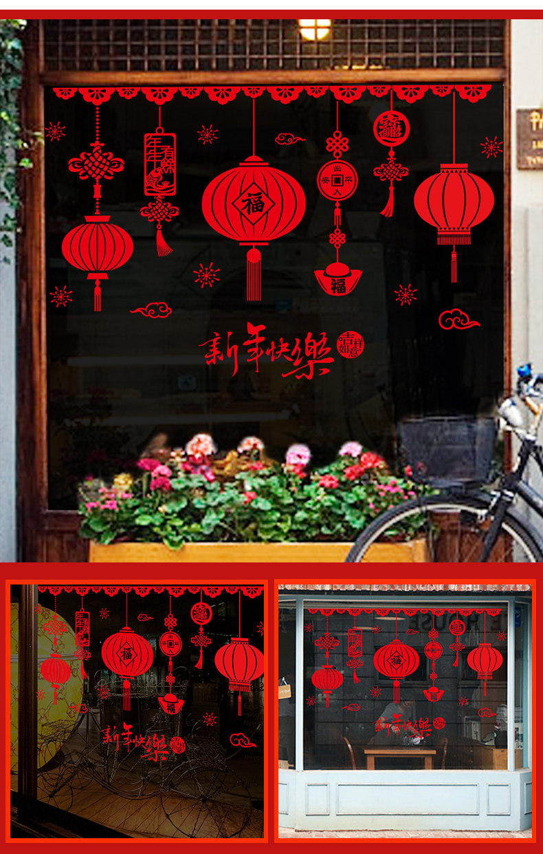 新年元旦装饰墙贴画福字灯笼墙贴店铺橱窗玻璃门窗花春节布置贴纸
