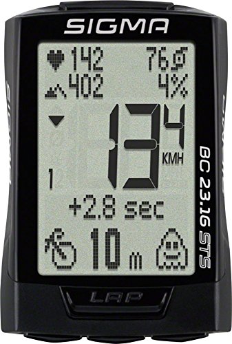 Studio : Sigma Publisher : Sigma Binding : Misc. Product Description The BC 23.16 includes wireless speed, cadence and heartrate along with altitude measurement displayed both numerically and graphically. It also features a ghost race function that allows the user to virtually race themselves. Altitude Functions: Altitude graph, Current altitude, Current gradient, Altitude gain/loss (cur. trip). Speed Functions: Actual Speed, Average speed, Comparison of cur./avg. speed, Maximum speed. Distance Functions: Trip distance, Total distance. Cadence Functions: Current Cadence, Average Cadence, Maximum Cadence. Time Functions: Ride time, Total trip time (Bike 1/Bike 2), Trip section timer. General Functions: Full text display with seven available languages, Predefined tire sizes, two adjustable wheel sizes, Automatic start/stop with motion sensor, Back-up function via memory chip, Battery status display (receiver transmitter), Automatic bike recognition, Automatic pairing, Backlight, Watertight, Temperature, Watt power (calculated), Average watt power (calculated), Ghost race. keyword search: BC23.16. 0