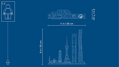 -. Feature : LEGO Architecture interpretation of Shanghai, China / Features iconic attractions Chenghuang Miao Temple, Longhua Temple and Pagoda, Radisson Blu Hotel, Bund area, Oriental Pearl, World Financial Center and the Shanghai Tower / The huangpu River is represented in the tiled baseplate / LEGO Architecture celebrates the world of architecture through the medium of the lego brick, and is developed for all with an interest in travel, design, architecture and history / Measures over 9" (25cm) high, 11" (28cm) wide and 2" (7cm) deep