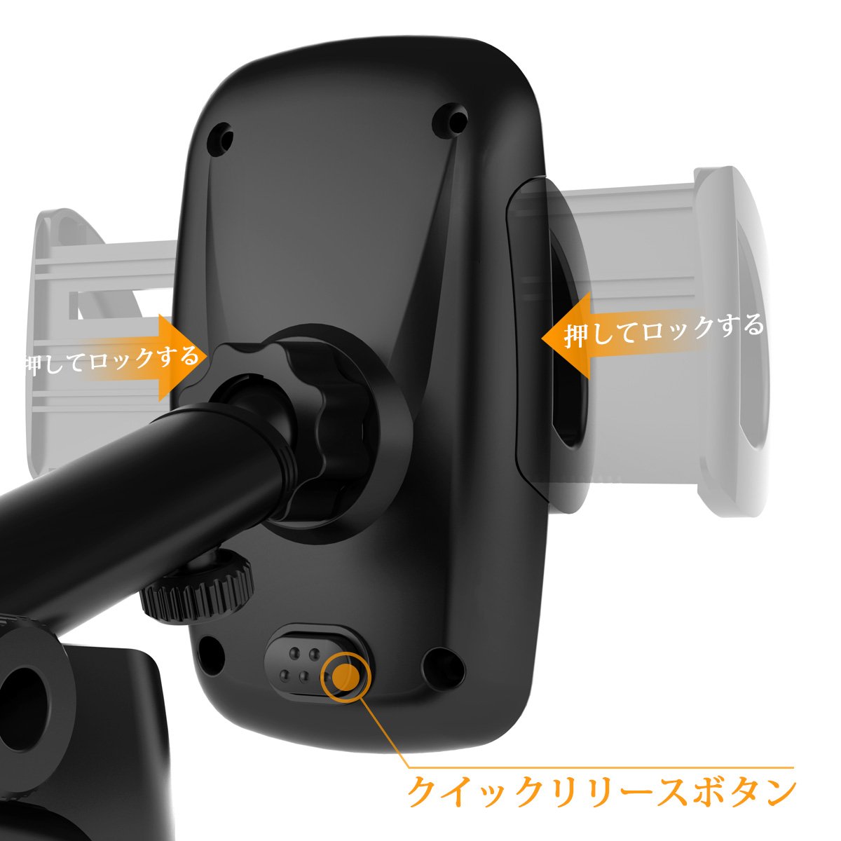 When you push the release button on the back of the holder, the arm automatically opens and the equipment can be firmly attached.