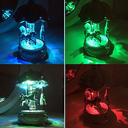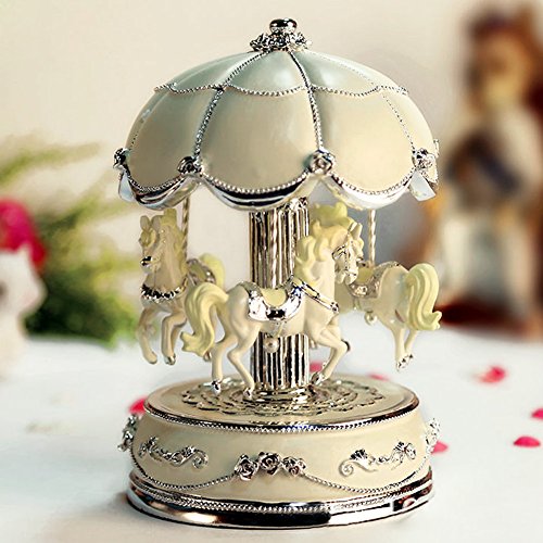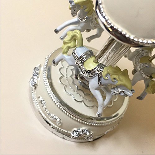- The music box is made of high quality resin with metal movement. Top with 3 horses can rotate with music. Beautiful flowers carving around the body of the music box