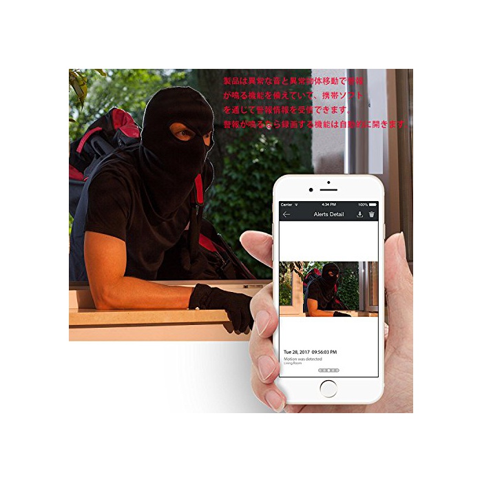 제품은 이상인 음과 이상 물체 이동에 경보가 울리는 기능을 대비해 있고, 휴대 소프트를 통해 경보 정보를 수신으로 옵니다.경보가 울리면 녹화 하는 기능은 자동적으로 엽니다.