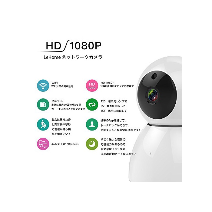 원본상품명: LeHome ネットワクカメラ監視 200万素 1080P高質 ベビモニタ ワイヤレス カメラ iP Camera ネットワク カメラ 暗視撮影 マイク通信可能 動知 アラム機能