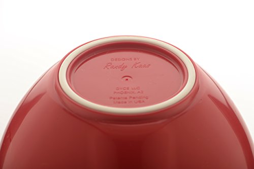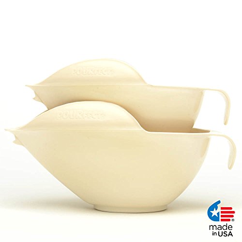 "The Original Spill-Proof Bowl" Made In USA POURfect® Bowl sets are available in 1-2-4-6-8-12 cup sizes. They are microwave and dishwasher safe and are made of stain resistant polypropylene. GRIP - Rests comfortably over your index finger, using your palm and thumb instead of grasping with your fingers. EGG CRACKING LEDGE - Convenient location to crack eggs while keeping the entire cracked egg inside the bowl. MEASURING GUIDE - English and Metric measurements inside the bowl. GULL WINGS - Fold ingredients back into bowl toward the pouring spout COMPLETELY eliminating overspill. RUBBER RING - Non-slip rubber ring adds stability to POURfect® Bowl when mixing ingredients. CHANNEL - Aligns ingredients to flow smoothly to the pouring spout. PIVOT - Securely positions bowl on another container improving control while pouring.DRIPLESS SPOUT - Flat edge on spout stops drip from running down the front of the POURfect® Bowl. BpA FreeFeature