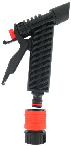 -. Feature : Powerful jet spray ideal for spot watering or cleaning up after planting / Pressure sensitive handle with locking back trigger / Set to spray continuously for effortless watering / Made of UV-stabilized and weatherproof ABS plastic / Quick-click adapter with water-stop feature