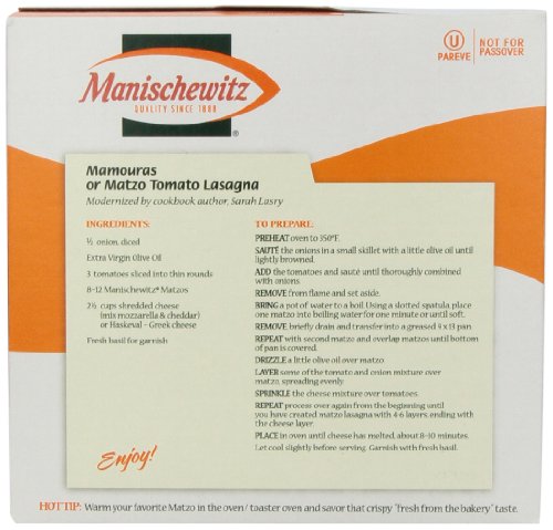 -. Binding : Grocery -. Brand : Manischewitz -. EAN : 0072700000161 -. Feature : 10 oz / USA -. IsAdultProduct : 0 -. Label : Manischewitz -. LegalDisclaimer : Actual product packaging and materials may contain more and different information than what is shown on our website. We recommend that you do not rely solely on the information presented and that you always read labels, warnings, and directions before using or consuming a product. -. Manufacturer : Manischewitz -. Model : cfuda -. MPN : 00029750 -. PackageQuantity : 1 -. PartNumber : 00029750 -. ProductGroup : Grocery -. ProductTypeName : GROCERY -. Publisher : Manischewitz -. Size : 10 oz -. Studio : Manischewitz -. Title : Manischewitz Unsalted Matzo, 10 oz -. UPC : 072700000161