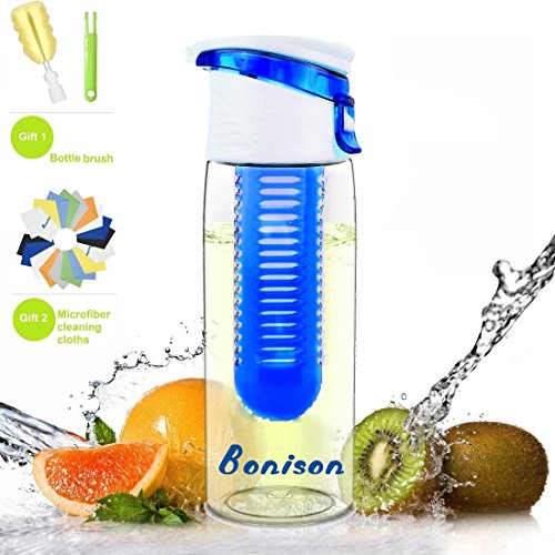 -. Feature : Bonison NEW design infuser water bottle,more better quality,more beautiful outlooking,come with two free gifts-bottle brush and screen clean cloth and unconditional return guarantee.Stylish infuser bottle with its hidden handle, it is easier to use and carry around with its moderate size that can fit in cars and most bags. / Refresh your body and skin by staying hydrated and drink fresh fruit water.For fruit,Juice, Iced Tea, Lemonade & Sparkling Beverages / Made of commercial garde Tritan, environmental-friendly material that is also safe to use and can be reused. Simple way to clean and dishwasher-friendly.You will get two free gifts in the box-bottle brush and Microfiber screen cleaning cloth. / Great healthy choice to build up good habit of drinking enough water with great taste and nutrient form fruit.shake and mix water with tasty fruit. Be healthy today and SHAKE your fun day up! / SAFE FOR YOU AND ENVIRONMENT-FRIENDLY; Tritan-made bottle is BPA free, enjoy your fresh-made drink without worrying toxic chemical from cheap plastic. Use fresh fruit of your choice to ensure you're getting fresh and natural flavor into your infuser. No need to read labels about other sugar and/or chemical contents those other beverages might have. YOU choose what YOU put in your beverage.