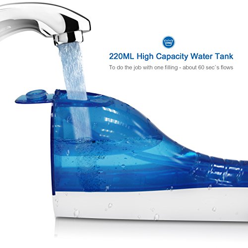HIGH CAPACITY WATER TANK(220ml/7.6 OZ) --- Large water reservoir to do the job in one filling. One filling offers you about 60 seconds` water flows, enough to get you through your lower and upper teeth front and back. Easy to fill the reservoir by pop-down the Reservoir Fill Door or take out the blue water tank and fully fill it on the top port