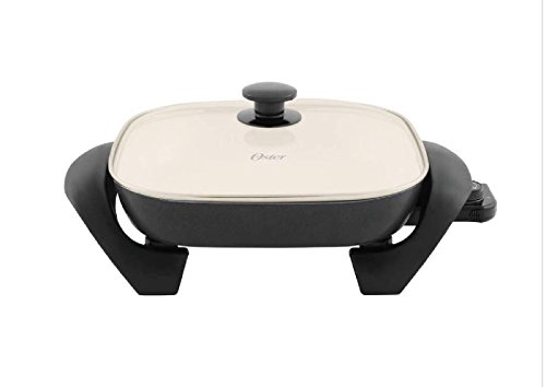 This electric skillet is designed with unique, innovative Titanium Infused DuraCeramicTM non-stick ceramic coating to last 8 times longer than ordinary non-stick surfaces. This extra-durable, super-hard surface won't flake or peel. Natural Titanium Infused DuraCeramicTM is PFOA and PTFE free and cooks up to 30% faster to save time and energy. Large 12" x 16" cooking vessel makes it easy and convenient to prepare one-dish meals. With the Oster® brand, you can cook with passion and serve with pleasure.Feature