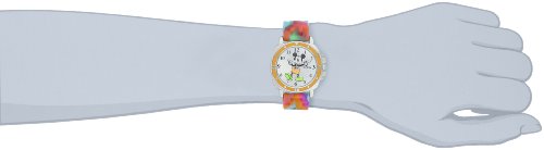 Silver-tone watch featuring Mickey Mouse graphic at center with rotating arms, Arabic hour markers, and contrast bezel